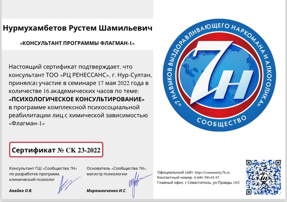 Ведущий специалист программы. Заместитель заведующего реабилитационного центра "Рекавери" г. Астана